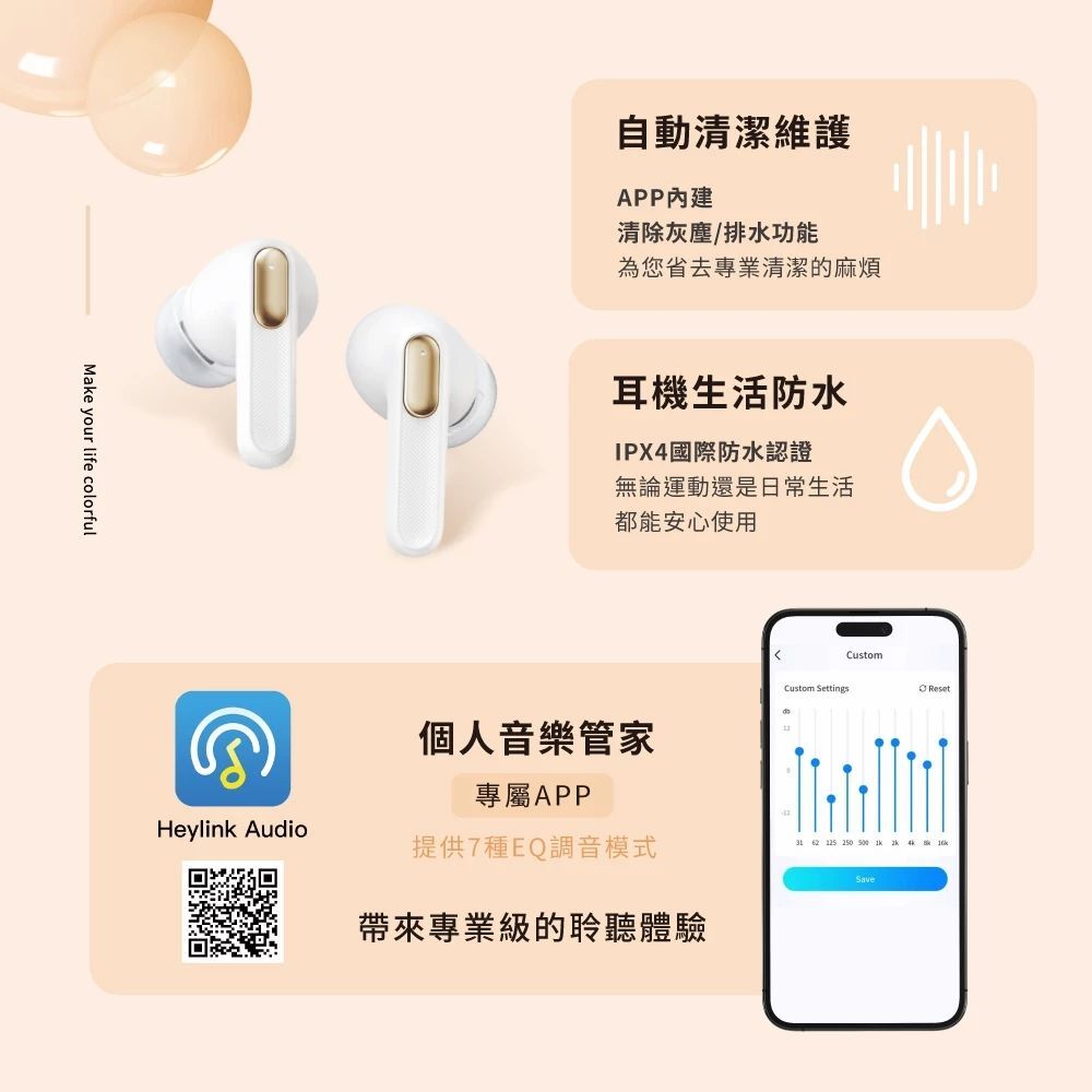 ● 個人音樂管家|專屬APP提供7種(6種預設+1種自定義)EQ調音模式,帶來專業級的聆聽體驗。