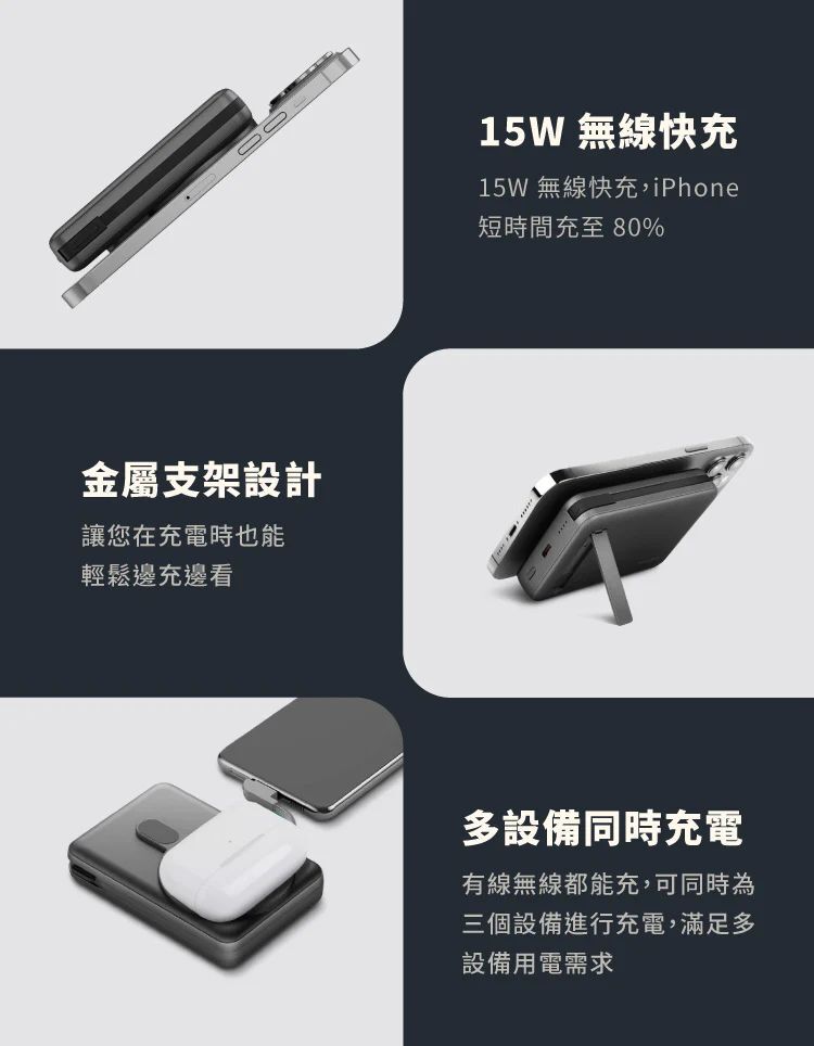 .支援同時為3個裝置充電,內建充電線、USB-C與無線充電