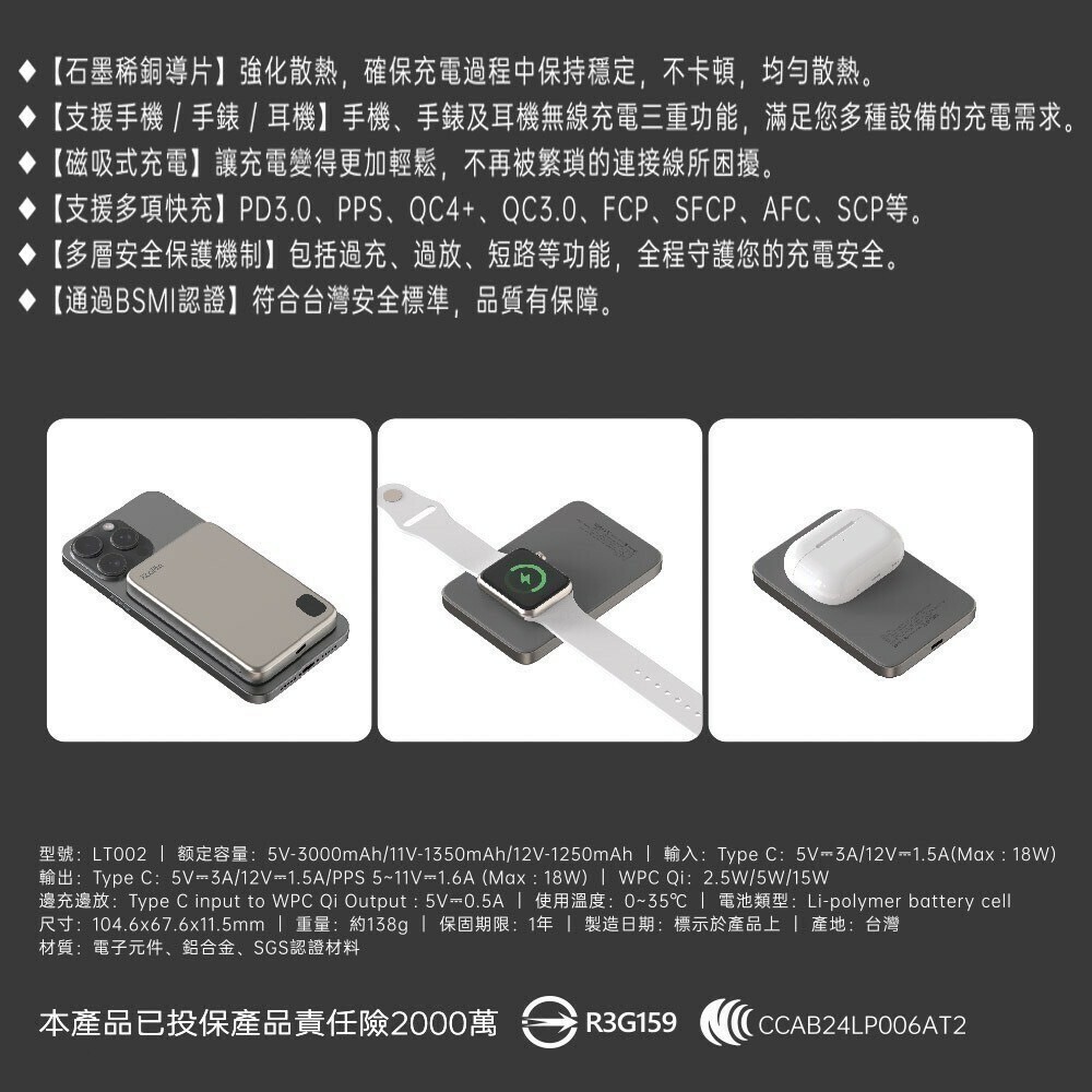 .18W快速雙向充電,具備電量指示燈。強力磁吸,無線充電不怕掉,支援全協議快充